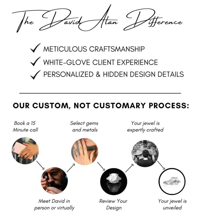 Start your journey on a 15-minute discovery call with David to learn about our Custom, Not Customary process. You will discuss your design ideas, diamonds, timeline, and budget.